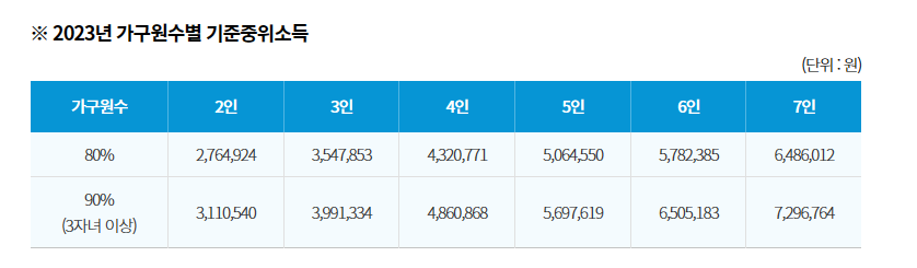 (단, 3자녀 이상 가구의 경우 기준중위소득 90% 이하)