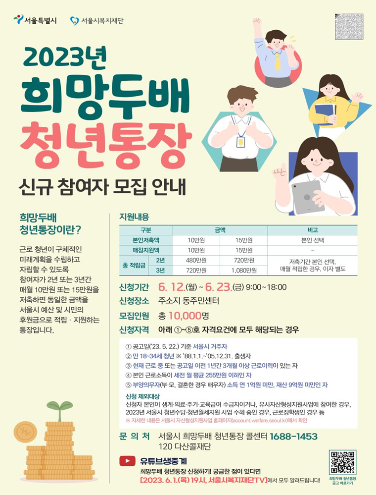 더 나은 미래를 준비하는 청년을 위해 서울시가 ‘희망두배 청년통장’ 참여자를 모집합니다. 참여자가 2~3년간 매월 10~15만원을 저축하면 동일한 금액이 추가 적립돼 만기시 2배 이상을 돌려받을 수 있는데요, 올해는 문턱을 낮춰 1만명을 모집합니다. 이와 함께 저소득가구의 자녀 교육비를 지원하는 ‘꿈나래통장’ 참여자도 같은 기간 모집합니다. 참여방법, 신청자격 등 자세한 내용 안내합니다.